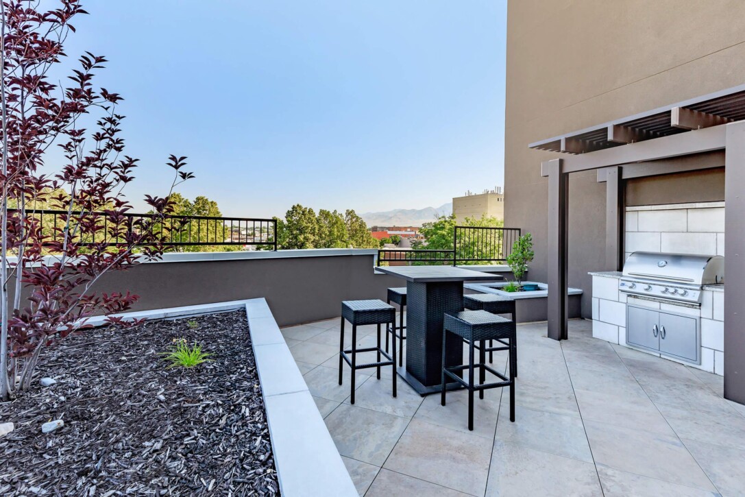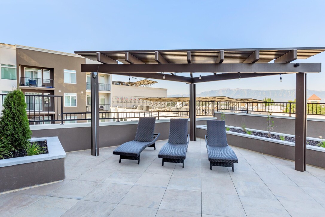 The multifamily rooftop amenity deck at Seasons on Mill Creek in Logan, Utah features Mbrico reinforced porcelain pavers from our Slate collection, installed over our patented pedestal track system.